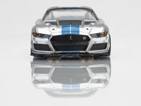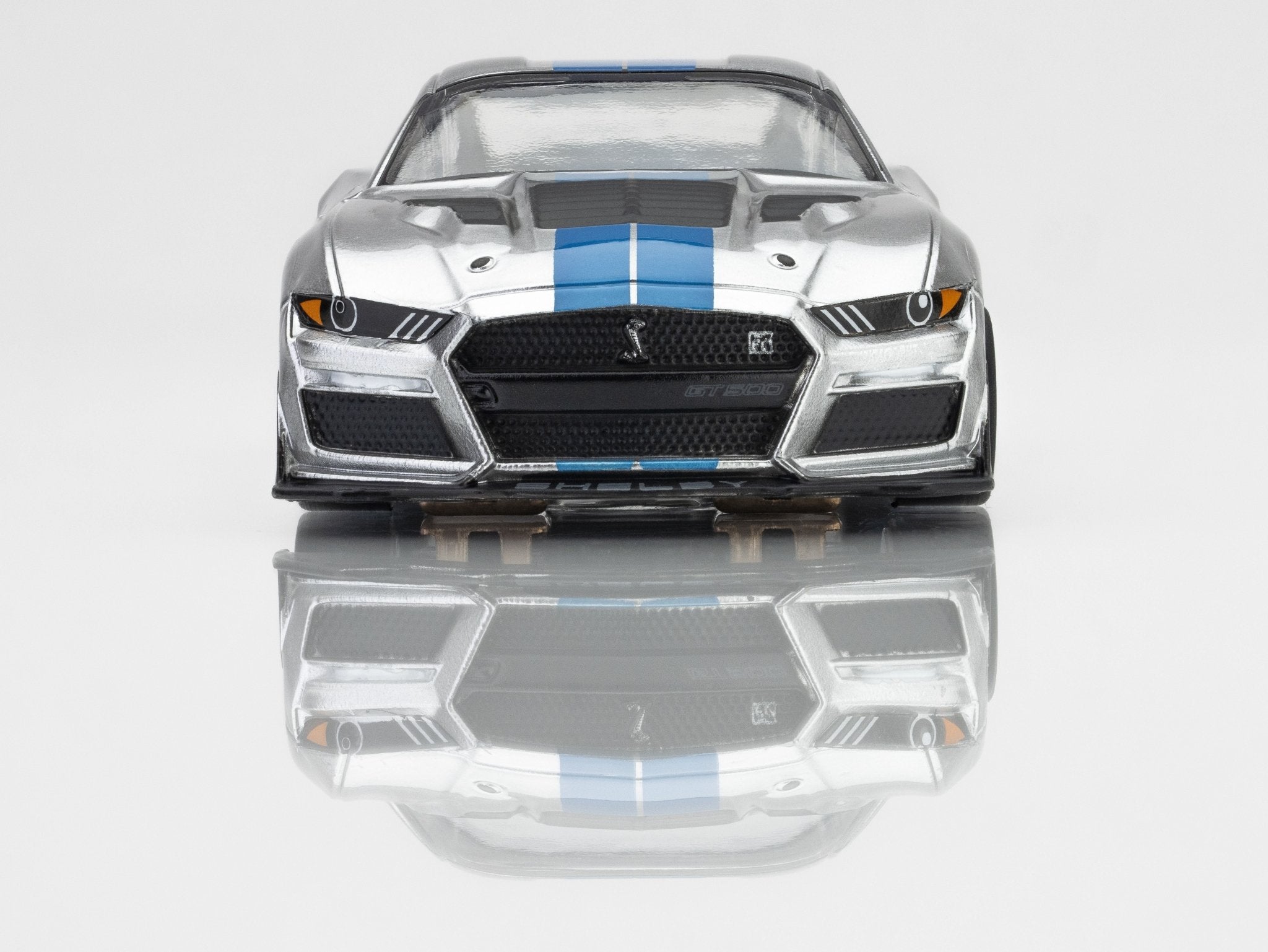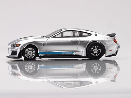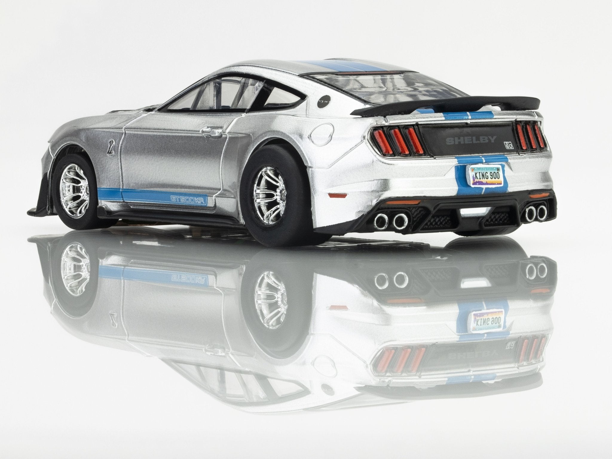 AFX displays this Mustang's unique design with a high-flying rear wing, intricate grill and muscular but sleek, sloping body. With striking blue stripes atop a shining silver, this car will turn anyone's head.