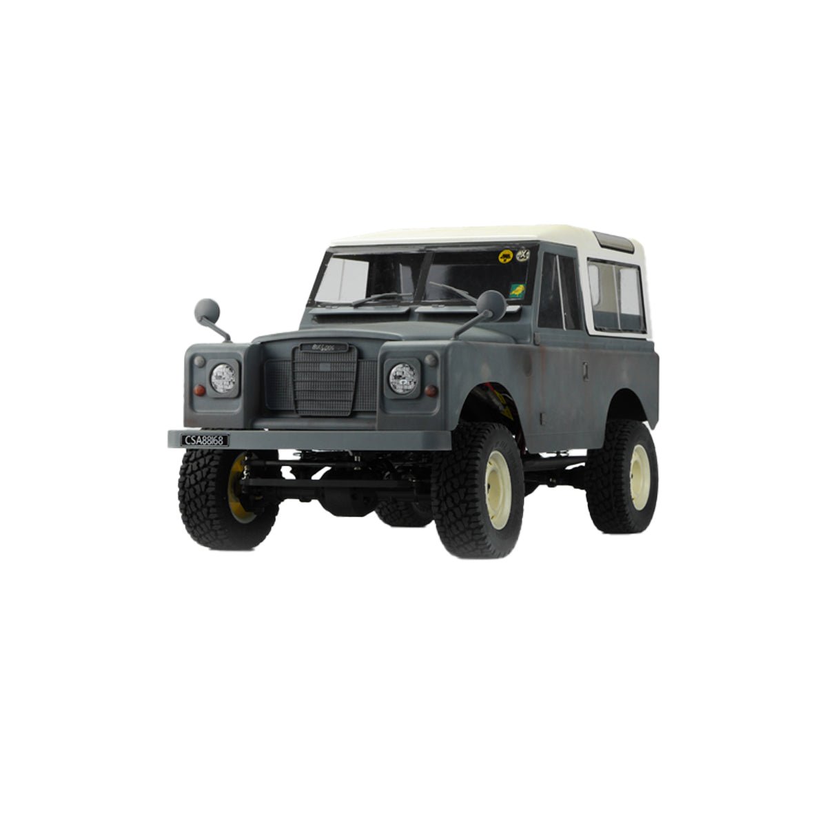 The main body and hood are painted in a specially selected matte finish paint, and in a very retro looking "Welsh Grey" color. In addition, each one is individually hand painted for special weathering finishes. Each one is unique. To contrast this, the removable roof is painted white and the true beadlock wheels are off white and are accompanied by realistic 95mm AT-SS Soft compound tires.