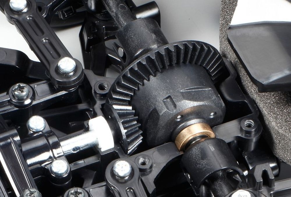 The shaft-driven 4WD TT-02 chassis employs a longitudinal layout with the battery on the left and the motor on the right, to give excellent stability. In addition, it features identical left and right suspension arms and uprights for ease of assembly, plus easy-to-maintain gearboxes. It is a highly adaptable chassis, as it offers 2 different wheelbases, 2 ground clearance settings and 2 tread set-ups in addition to a range of 10 possible gear ratios. It is not short on looks either, with brake disc-shaped wheel hubs and stylish front bumper supports. Black 12-spoke wheels are paired with slick tires for a racy finish.