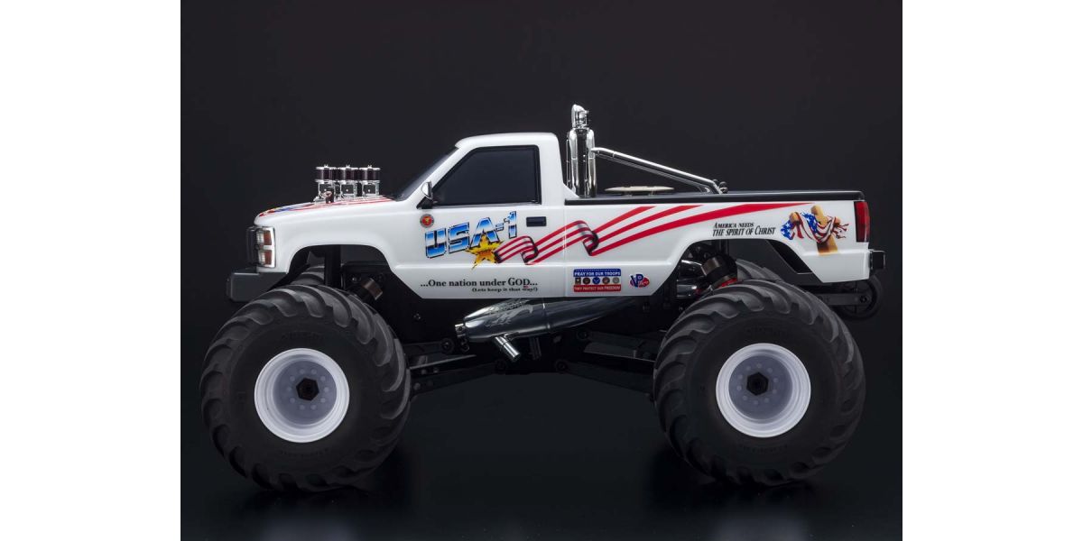 Built on a pickup truck chassis, large diameter tires and big engines with massive horsepower were installed by fun-loving American off-roaders to create the monster truck. These ever-popular monster trucks can be seen on specially-made racing circuits or jumping rows of cars in stadiums across the USA. Many R/C monster truck models have been produced over the years. First among equals is the legendary 1/8 scale USA-1 that embodied the might of American trucking power during the 1980's and 90's. Officially licensed by Kyosho in the 1990's, the R/C model uniquely captured the power and glory of the USA-1. Now it's 'comeback-time' for the USA-1, with modern chassis and drivetrain technology, upgrades unique to the USA-1 throughout, and a newly-designed 'ULTRA SCALE BODY' with form and detail finished to display-model standards. The iconic American flag graphic emblazoned on the body makes your heart swell with pride! The chassis features shaft-driven 4WD and 5-link suspension based on the Mad Crusher 2.0 & FO-XX models. Most of the suspension components have been uniquely upgraded and reinforced for the USA-1 at each point to handle the powerful KE25SP2 engine, and the rigors of monster trucking. A 3-speed automatic transmission produces dynamic acceleration, which is enhanced by a true suspension system to produce "scale" running characteristics worthy of the prestigious USA-1, and make you feel like a monster truck driving god. Released as a pre-assembled Readyset, the USA-1 is almost ready for action straight out of the box.