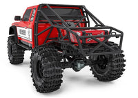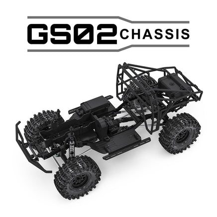 The kit is built on a scale-looking ladder frame construction with stand-up front shock and lay-down rear dampers that make way for the scale roll cage construction. The steering servo is located in the front part of the chassis and the steering assembly is of a zero-Ackermann design for maximized steering performance. Angled front king pins minimize the scrub radius for further increased steering efficiency. The heavy-duty threaded aluminium shock absorbers utilize 3.5mm shock shafts and the transmission, with all-metal internal gears, is of a torque twist reducing design. Optionally a 2-speed hi/lo transmission conversion will become available to add speed when needed. The kit is rounded out by grippy tires, a cool looking body shell a couple of scale accessories.