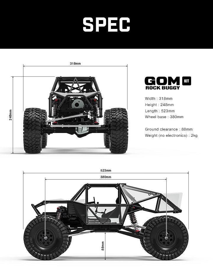 The GOM (translates to "Bear") features a lightweight, extremely rigid tube chassis that not only looks extremely scale, but protects against impact. The steering servo is mounted to the chassis, and bump steer has been minimized to provide the best possible steering performance. The dustproof receiver box and easy access battery door provide plenty of space for your components.