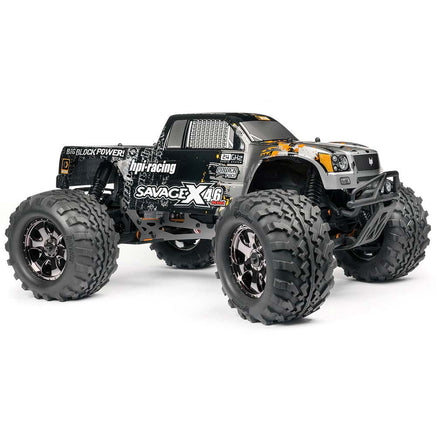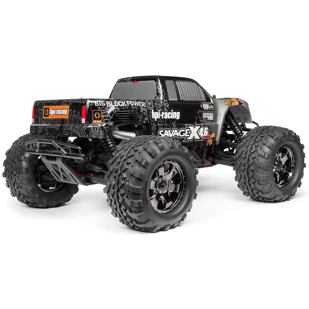 The Savage X 4.6 features the fantastic GT-3 truck body in Silver/Black. The GT-3 body comes completely trimmed, decaled and mounted for the ultimate in ease. The intricate paint designs feature an action sports inspired layout for concours quality appearance. And you can always customize your truck with any of the clear or pre-painted polycarbonate body shells from the huge assortment of HPI bodies and other manufacturers as well! For great looks, the Savage X 4.6 is topped off with a clean set of black chrome Warlock wheels, a grey anodized engine head, and orange anodized aluminum parts.