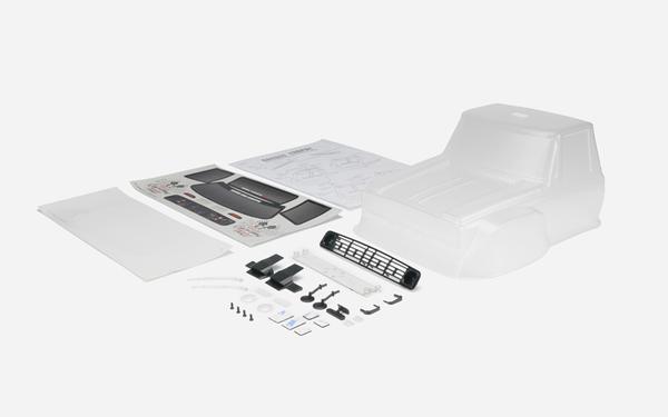 NOTE: The cab can also be used for custom builds and features a wider stance and flared front arches. The body is supplied uncut and clear ready to be painted with suitable polycarbonate paint. Images shown are of the cab combined and painted to show the finished look.