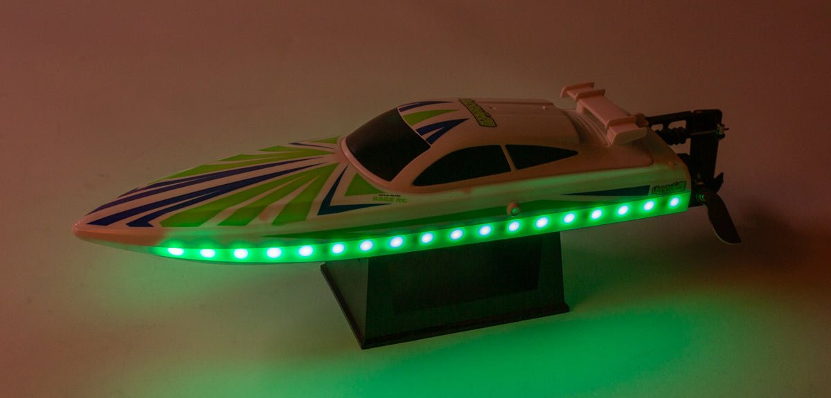 The Rage RC LightWave 400BL is the ideal size boat for racing across your local pond or lake. A 2600Kv brushless motor provides fast, efficient power and the included 3S 11.1V 1000mAh LiPo battery pack provides long run-times. Like most other Rage RC boats, if the LightWave 400BL ever capsizes, the self-righting feature flips the boat right side up, so you can quickly continue to race. Plus, the unique built-in Multi-Color Hi-Vis LED light strips give great visibility in any lighting and provide differentiation so that you can easily race more than one of these new boats at the same time.