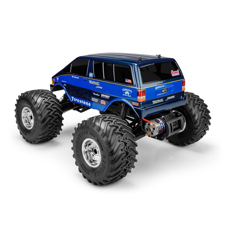 The unique shape of the body requires special and included #5120 angular front bracket for the standard front mount to position the mount at the correct angle for the van body. The included JConcepts rear body mount is built for the square post retainer located in Traxxas body mount kit #TRA3619 (not included). This provides a steady and dual post assembly for the rear with the capability to reach the top of the Aerostar van body. The clear body is packaged with licensed Ford Aerostar decal set, BIGFOOT 4X4 Shuttle decal sheet, injection molded body mount accessories, and window mask for quick and easy paint.