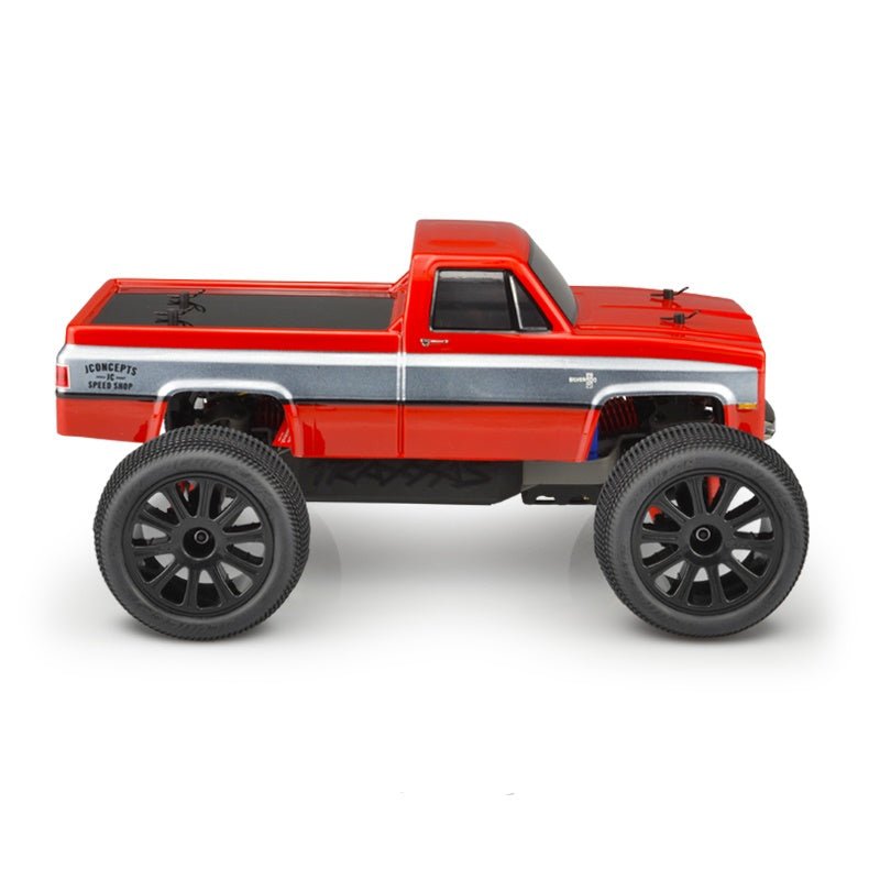 Officially licensed by General Motors to JConcepts Direct fit for Traxxas 1/16th E-Revo (Requires TRA7215 body mount set) Scale inspired body, cab and window design Multiple, 1:1 headlight and grille treatment options Clear heavy-duty polycarbonate with protective film Window masks and detailed GMC and Chevrolet decal sheet included