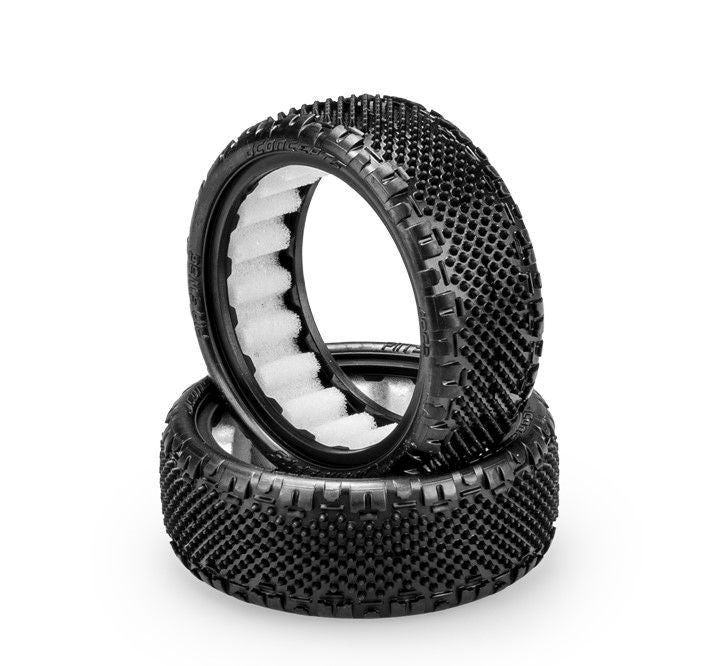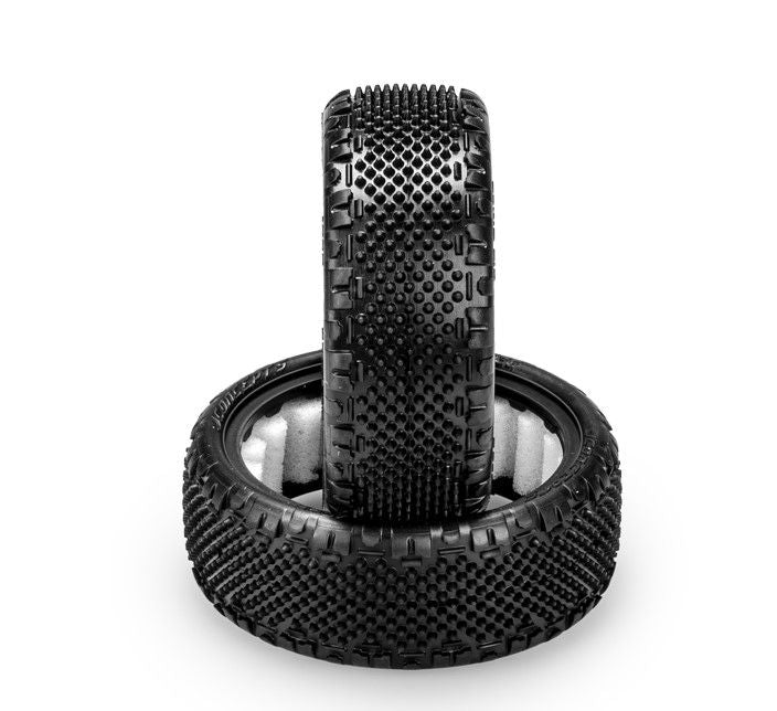The Pin Swag tire combines the outer lugs of a JConcepts Swagger front tire with the dense arrangement of specialty pins. Optimized as a 2wd front tire with wide body carcass, the pins themselves are round and crisp to the top where they climax to a point. Near the sidewall, the Swag enters with a smooth transition and drops off to a ledge giving steering control.