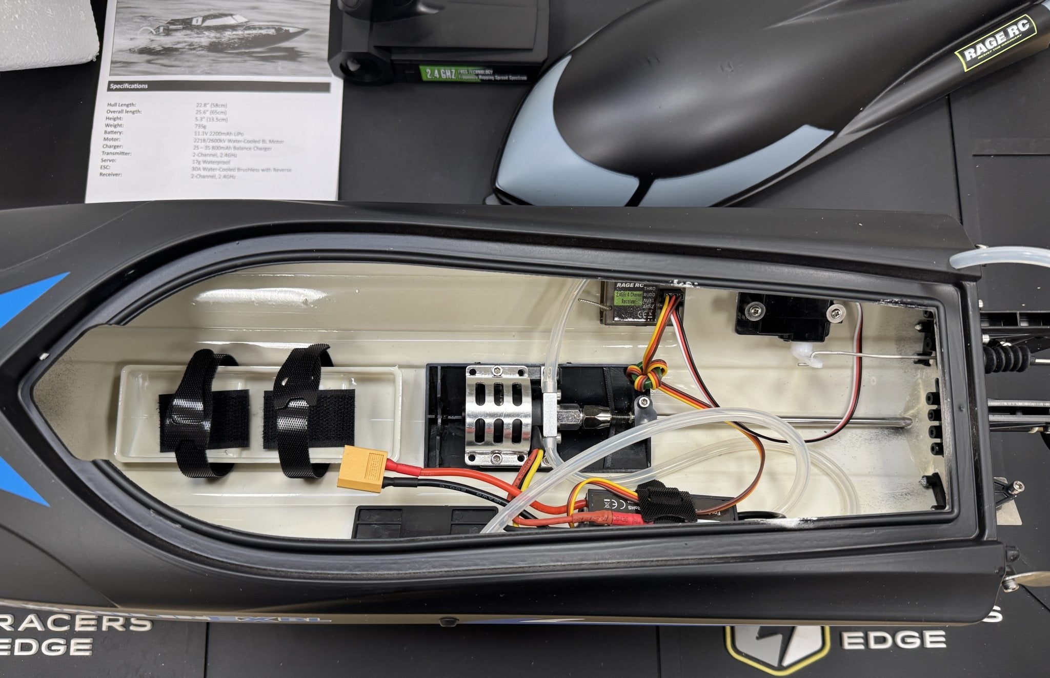 Like its predecessor, the Rage RC Black Marlin EX BL will have you racing across your local pond or lake with brushless power in no time. The impressive speed is generated by the installed powerful brushless 2600KV motor in combination with a 30A Water-Cooled ESC with reverse and the included 3S 2200mAh LiPo battery pack. Equipped with a 17 gram waterproof servo and pre-installed stainless steel trim tabs and turn fins, the EX BL comes out-of-the-box with great handling making it easy and fun to drive. And, if all that speed leads to getting capsized after too tight of a turn, the EX BL now includes the key feature of self-righting - which allows the boat to automatically turn right side up within seconds!