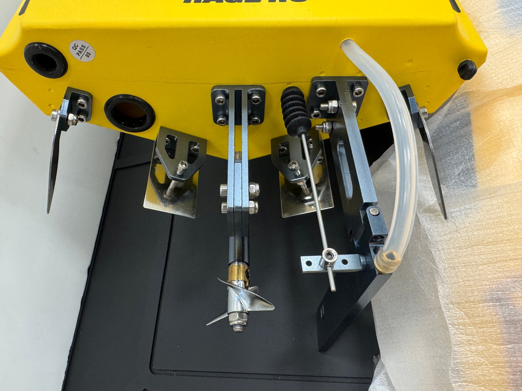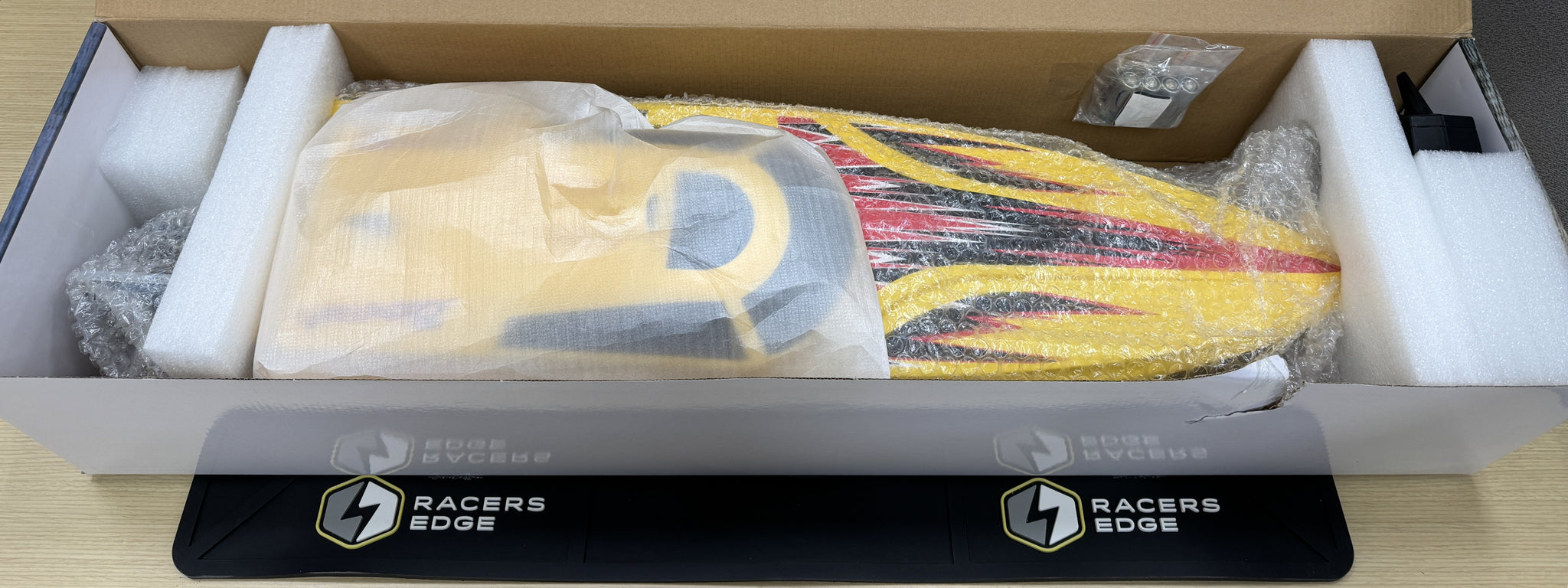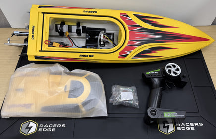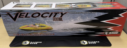 The Velocity 800BL is propelled by brushless power that will have you flying across the water at adrenaline-pumping speeds of over 45MPH! Performance is delivered by a brushless, water-cooled 1750kV motor, and harnessed by a 60A water-cooled electronic speed control. This offshore rocket ship features a durable uni-body ABS hull that arrives pre-painted with a unique matte yellow finish and bright, bold graphics that combine to give the Velocity a fast, aggressive appearance. The durable zinc/aluminum alloy propeller, anodized aluminum rudder, and stainless running hardware provide a rugged, yet elegant look that completes the package, making the Velocity 800 BL a great looking, high-performance boat that looks as fast on the included display stand as it does on the water. Should high speeds, aggressive turns, or rough seas cause the boat to flip or capsize, the unique self-righting feature automatically turns the boat right-side-up within a few seconds, allowing the driver to bring the Velocity back to dock safely.