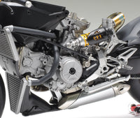 Tamiya has expanded its 1/12 scale motorcycle model series with this model of the Ducati 1199 Panigale S. The Ducati 1199 Panigale, which was the base for the bike depicted by this model, was announced at the 2011 Milan Motor Show. It is a breathtaking fusion of beautiful looks and cutting-edge technology, featuring a designed engine, monocoque frame with air box and much more. The 1199 Panigale S features upgrades to its suspension, wheels, lights and other parts for an enhanced riding experience.
