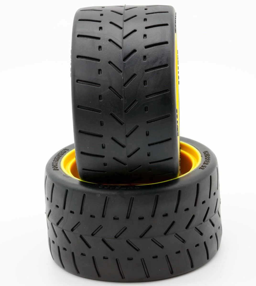 Note: These are 54mm wide tires. Most of the stock 1/8 GT tires are 40-42mm wide. You can use our Gripper 42 for the front and these Gripper 54 in the rear for a better grip and handling. The height of Gripper 42 and 54 is the same 100mm so you do not have to change any diff gears.