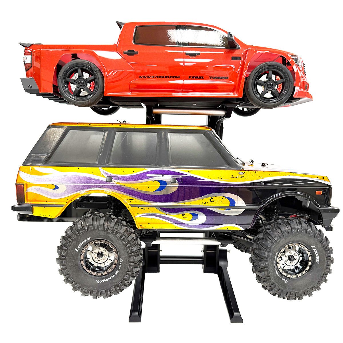 The 1/8 Pit/Display Stand by Racer's Edge is a two-layer stand designed to hold up to two 1/8 scale RC cars, with a compact fit for 1/8 scale models. Its foldable design and included carrying bag make it ideal for travel and racing events. Constructed with strong aluminum legs and hard nylon arms, the stand offers a lightweight yet rigid structure to securely display your cars. Anti-slip pads are included to ensure stability