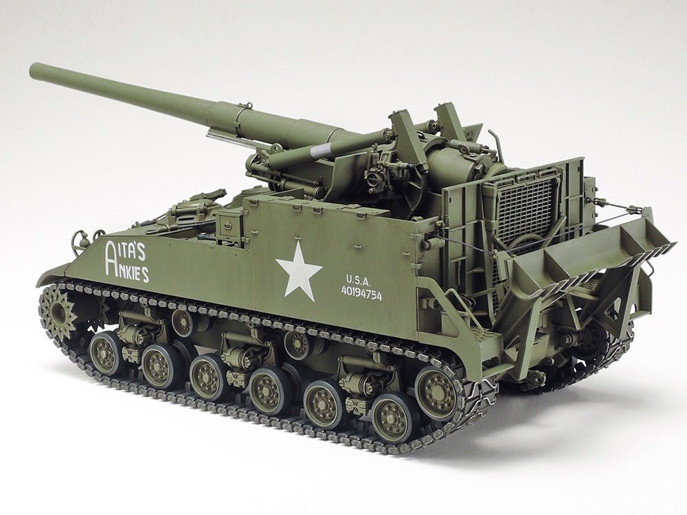 This is an assembly model of the U.S. Self-Propelled 155mm M40. It is a never before seen subject in the Tamiya line-up of 1/35 scale models. The kit uses all new tooling with the exception of the suspension parts as they are from the M4A3E8 Sherman "Easy Eight" model kit. The M40 was a significant step in U.S. Army artillery mechanization, pairing the M1 155mm gun with the proven M4 Sherman chassis. Armor was light given its intended use as a long range weapon (they were effective up to 23.5km) away from the front line, while the layout was changed from the M4 to allow a big fighting compartment at the rear to accommodate the big gun. It was fitted with smooth horizontal volute spring suspension (HVSS). Over 400 were produced before the end of WWII; although they never fought in the conflict, one example of their T83 prototype did. The M40 served in the Korean War, and was eventually replaced by the M53.
