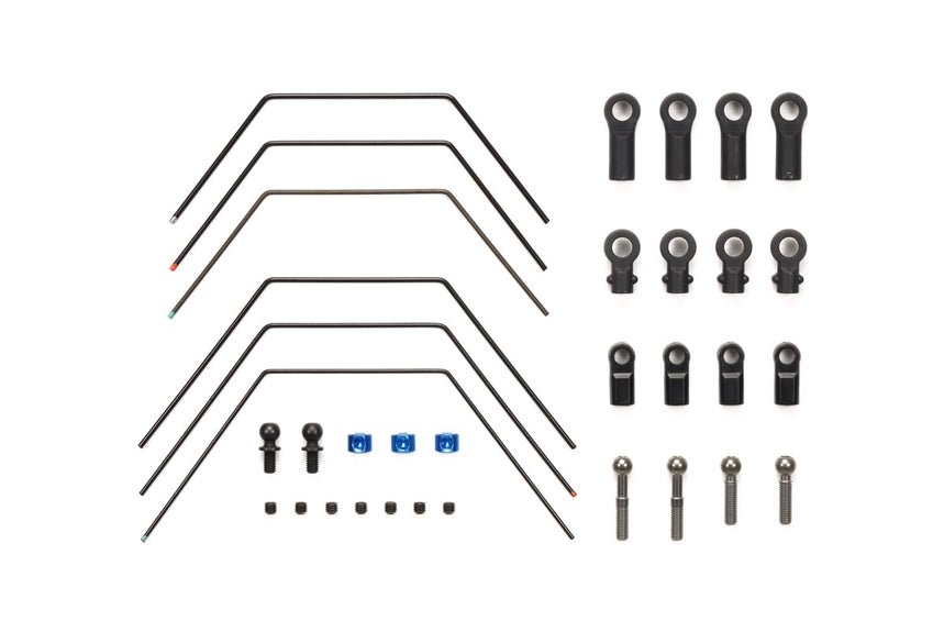 Fine-tune your TA-07 chassis setup using the stabilizers in this set, which features three different stiffnesses of soft stabilizer bar for both the front and rear of the car. It could gain you vital fractions of time on the track!Front Stabilizer Bars (1.3mm, 1.2mm, 1.1mm) x1 each Rear Stabilizer Bars (1.2mm, 1.1mm, 1.0mm) x1 each Stabilizer ends integrated with adjusters give a lightweight finish that eases pit work. Compatible with TA07, TB-05 and TRF420 chassis cars.