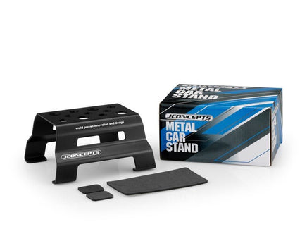The JConcepts metal car stand is perfect for the 1/8th or 1/10th racer looking to add a little sturdiness to their racing program. The all-aluminum formed and cut piece, designed by JConcepts, has a unique shape, cut-outs for handles and features laser etched logos for identification. The item stands tall and keeps the wheels off the ground for an array of vehicles.