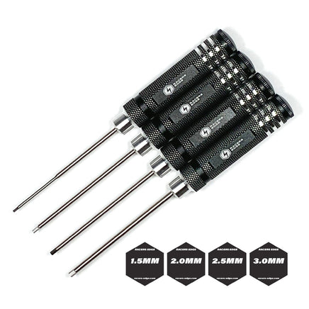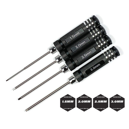 Machined Aluminum handles provide comfort while using. "Button" allows for continuous pressure to be applied while adjust grip. Steel tips provide long life and strength. Tips are keyed so they can be replaced if they ever break. Handles anodized black before machining. Set includes the 4 most common metric hex driver sizes.