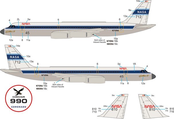 This Convair 990 comes from the Revell tooling. All new box art and NASA decals created by Starfighter Decals and box art by Rusty Cowart. This kit does not include any clear parts, however they have inlcuded the swivel stand. The slot in the fuselage will need to be completey cut out to accept the mounting ball.