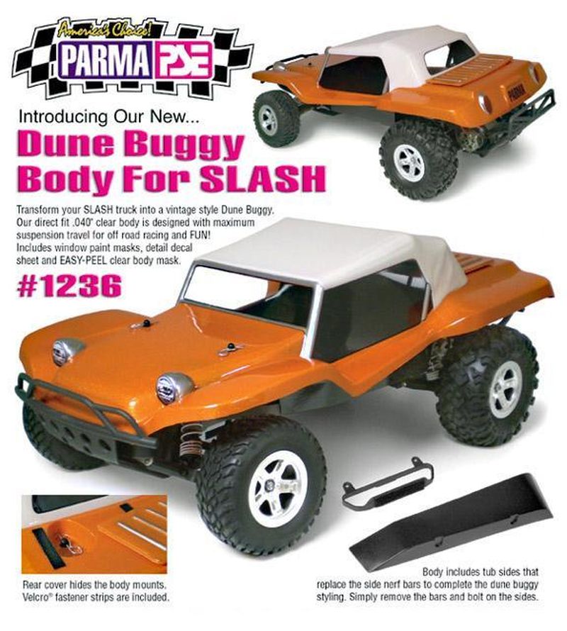 PARMA/PSE .040" thick clear body w/window masks. Fits most Short Course Trucks, Drag Chassis. Shown on the original Traxxas Slash 2WD truck chassis. Also fits 4WD models. Front body mounts may need modification. Place clear body over existing mounts on chassis to fit and mark body post holes before painting. Body measures: 13" WB, 11.75" Width, 21.5" Long and 5.75" High.