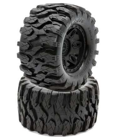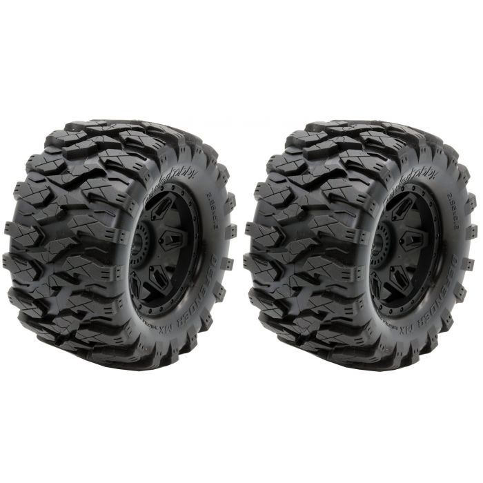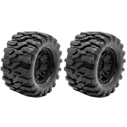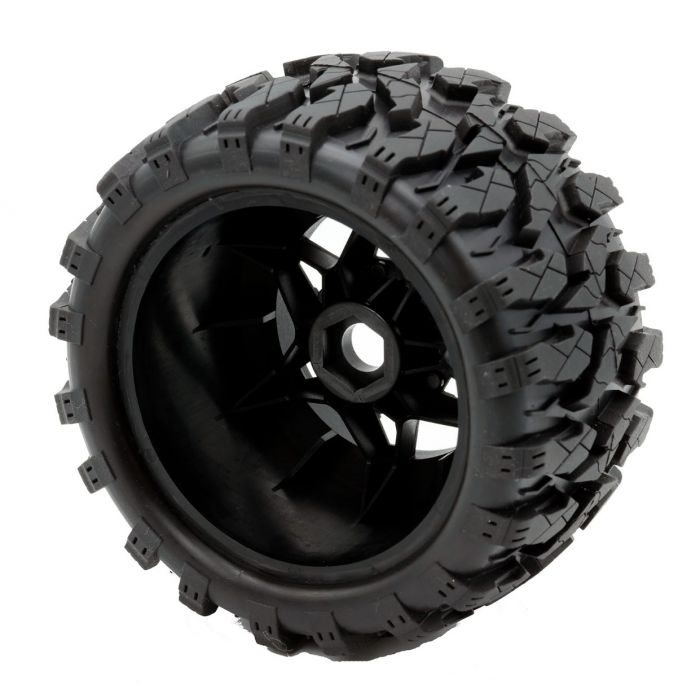 Other Monster Trucks with 17mm HexesSoft/Medium treated profile for the maximum traction and the maximum lateral grip Inside belt flexible but very strong, vulcanized directly together with tire compound Insert foam with special material for high temperatures, WJ cut for high precision Spoked wheel molded with special material and with a flexible structure for maximum grip and stability Includes: Two Pre-Mounted Tires Wheel Hex: 17mm 1/2" Offset Height: 5.6" Width: 2.96"