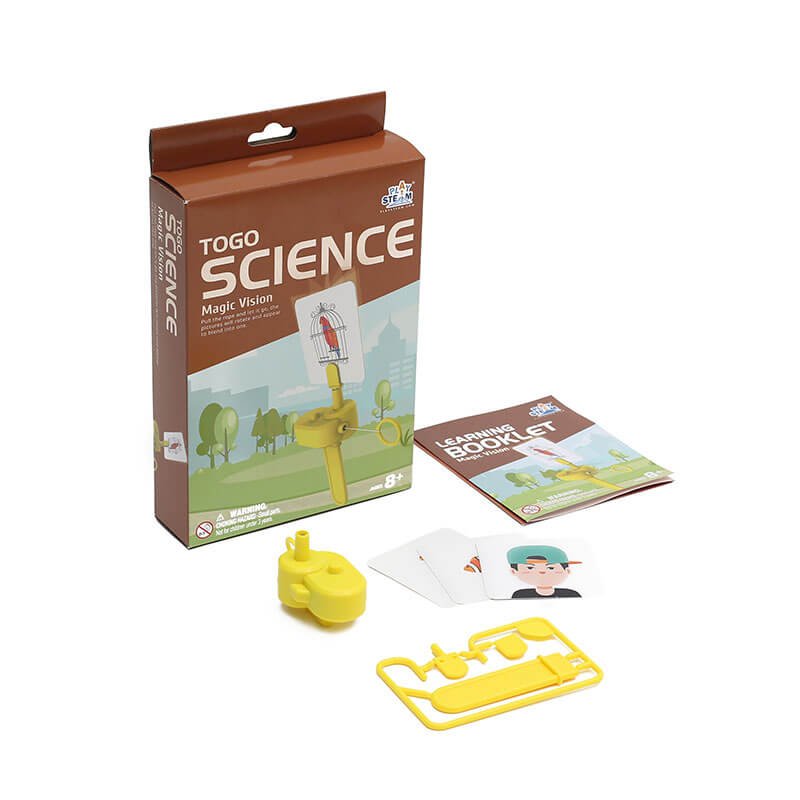 Pull the rope to view 3 different images and draw your own to see them blend as one image. Learn about "the persistence of vision", the theory that images persist in your brain a few moments after you see it. Use your imagination to create and flip through different images.